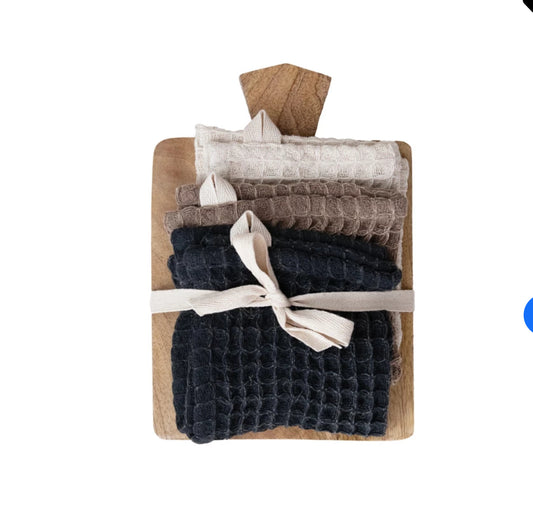 (3) Waffle Weave Dish Cloths w/ Cheese/Serving Board, Set of 4 Tied w/ Cotton Tape