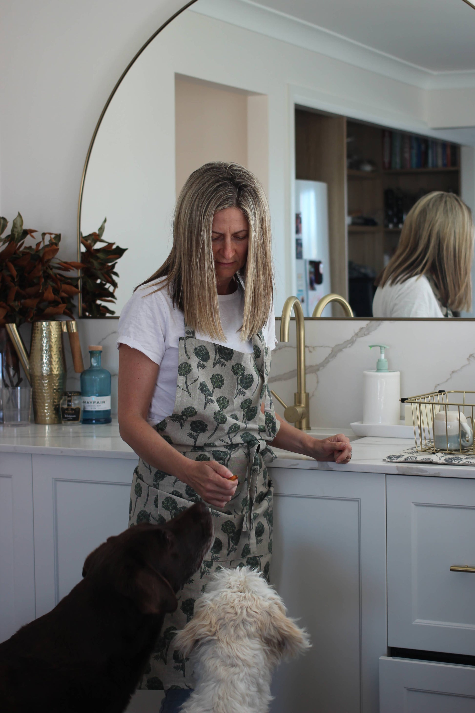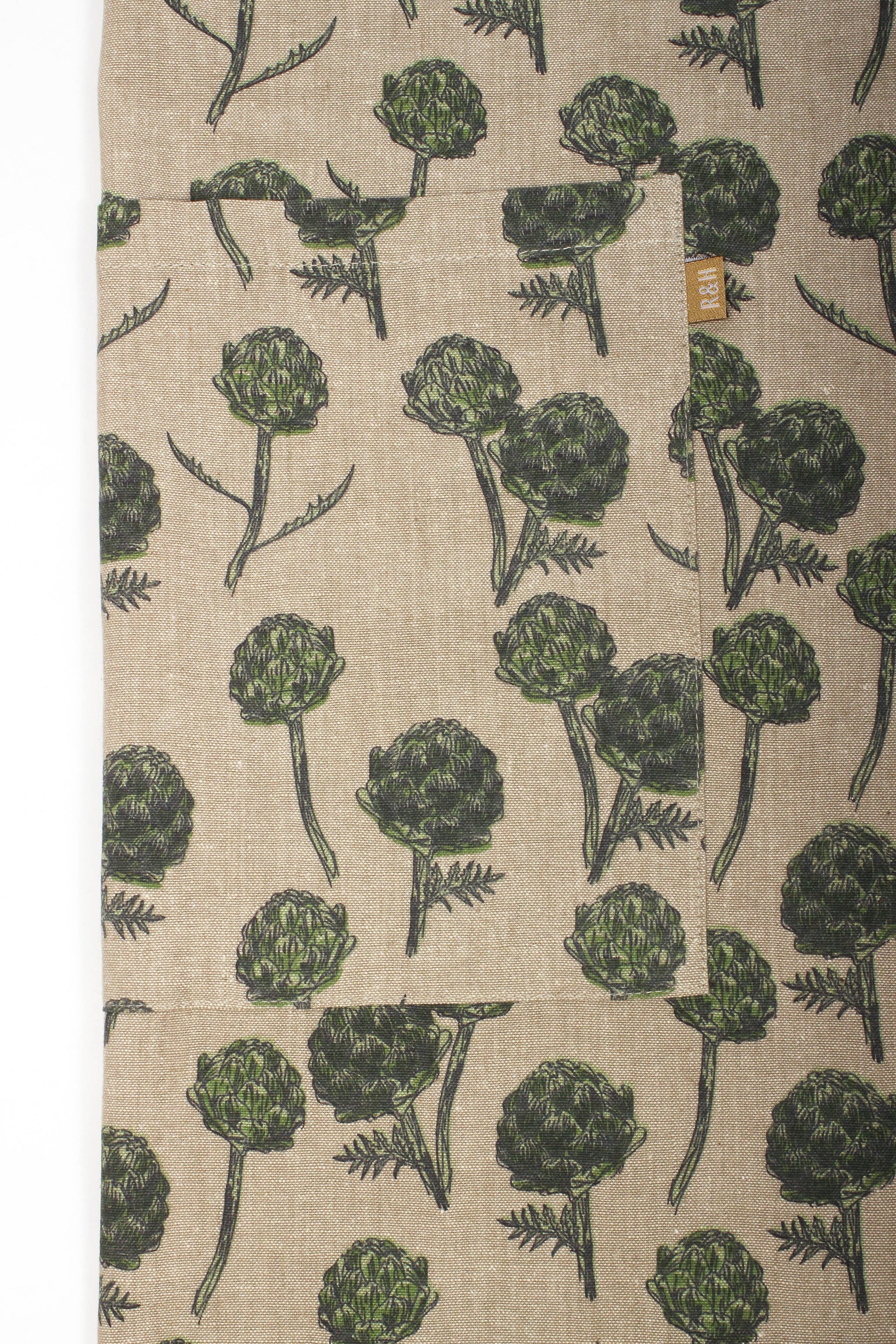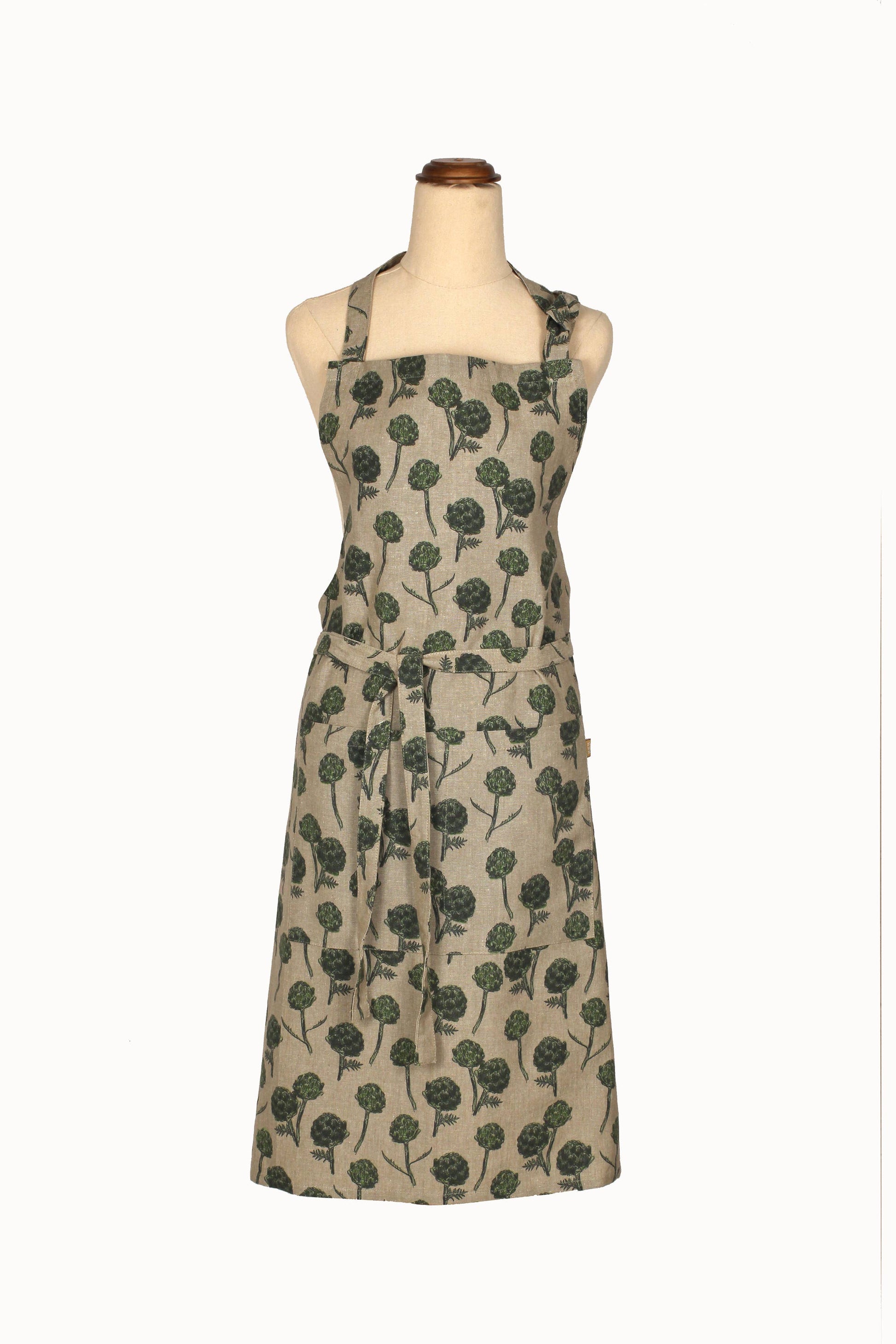 This apron easily ties around the waist. It features the pretty Artichoke print in Burnt Olive. 100% recycled cotton and natural dyes. Two pockets.