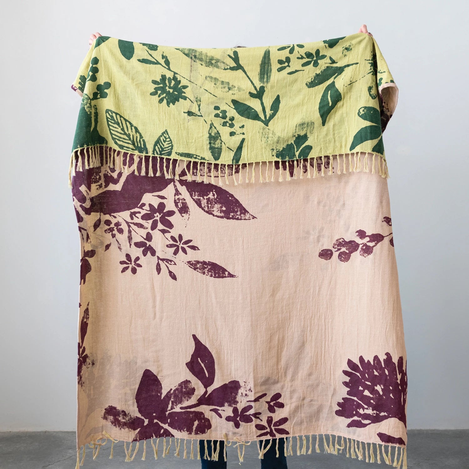 60"L x 50"W Two-Sided Cotton Double Cloth Printed Throw w/ Florals & Fringe, Multi Color