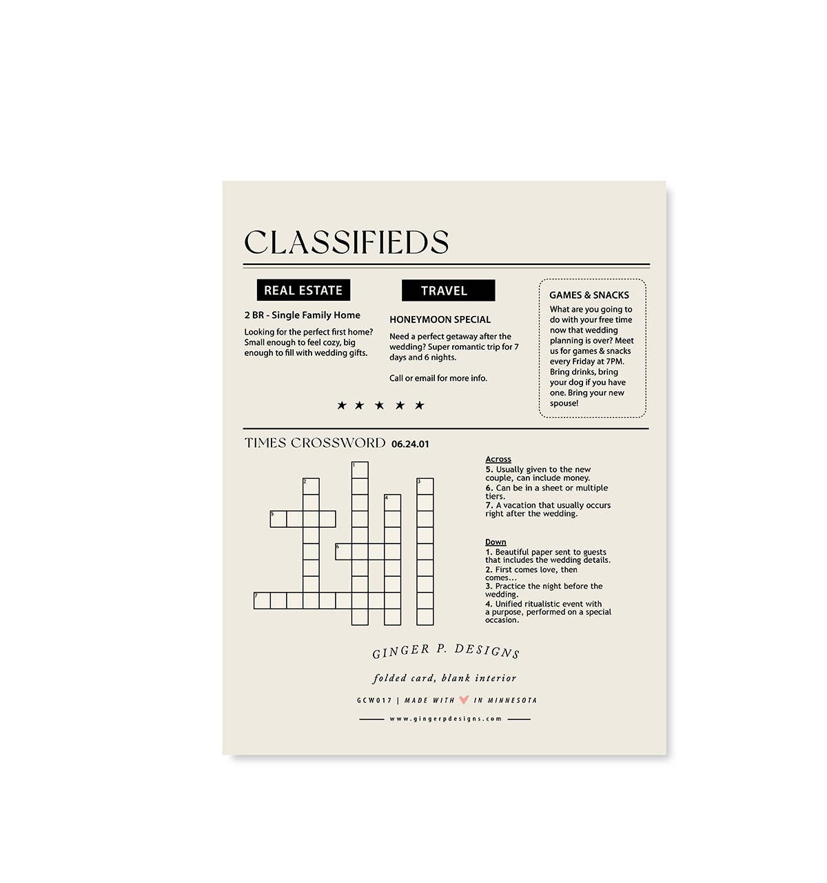 Hot off the press! Our Newlywed Times card is witty and adorable - even has a real crossword puzzle on back. Full - color 4.25" x 5.5" folded cards. Blank interior. Antique gold shimmer envelope